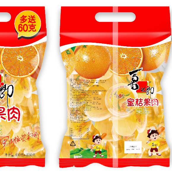 水、蜜桔果肉(≥15%)、白砂糖、魔芋粉、食品添加剂(卡拉胶、乳酸钙、氯化钟、柠檬酸、柠橡酸钠、山梨酸钾、甜蜜素、B-胡萝卜素、柠檬黄、日落黄)、食用香精