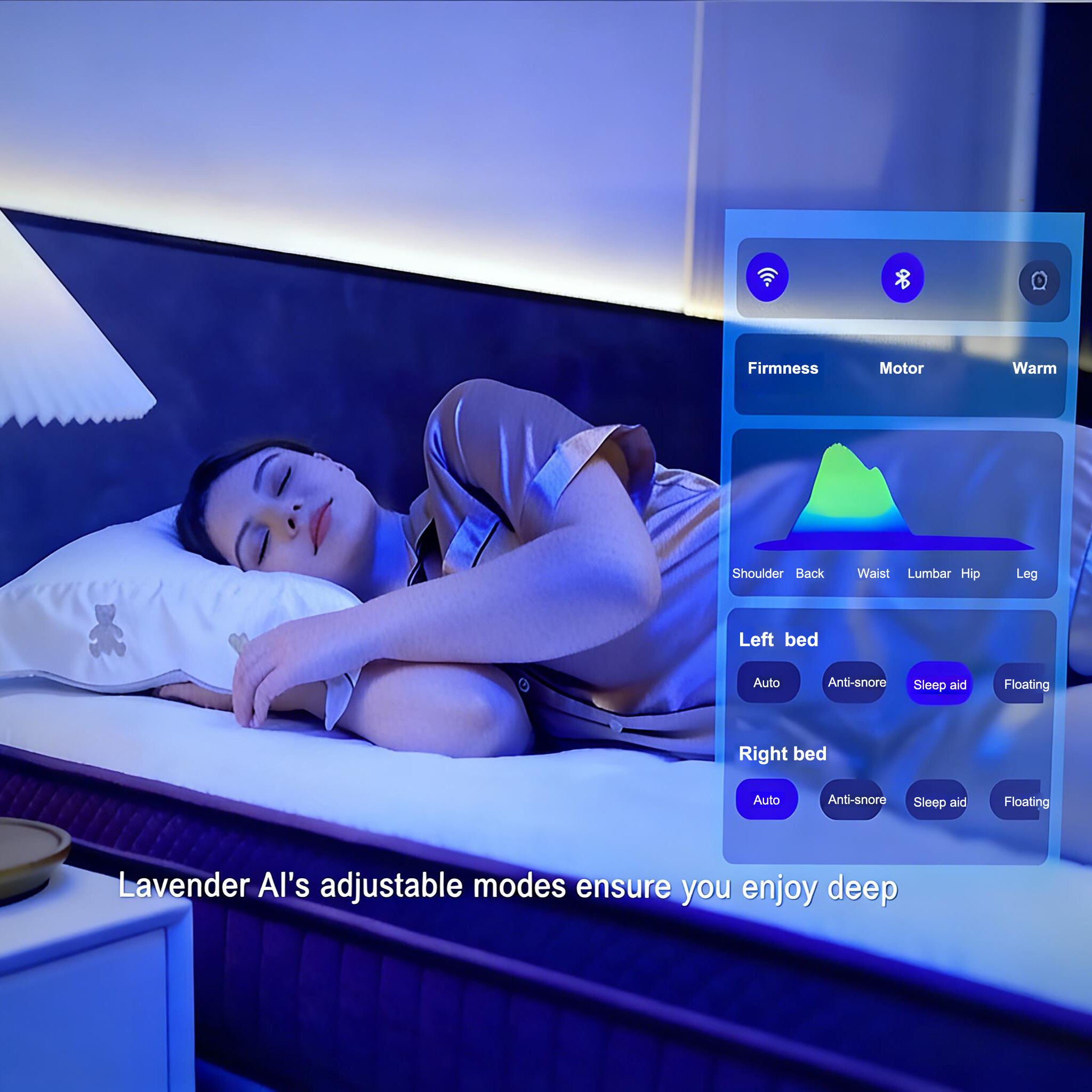 AI自动智能软硬调节,AI自动助眠,AI自动按摩,AI自动防鼾(气囊涌动算法),睡眠监测,心率监测,呼吸监测,睡眠报告