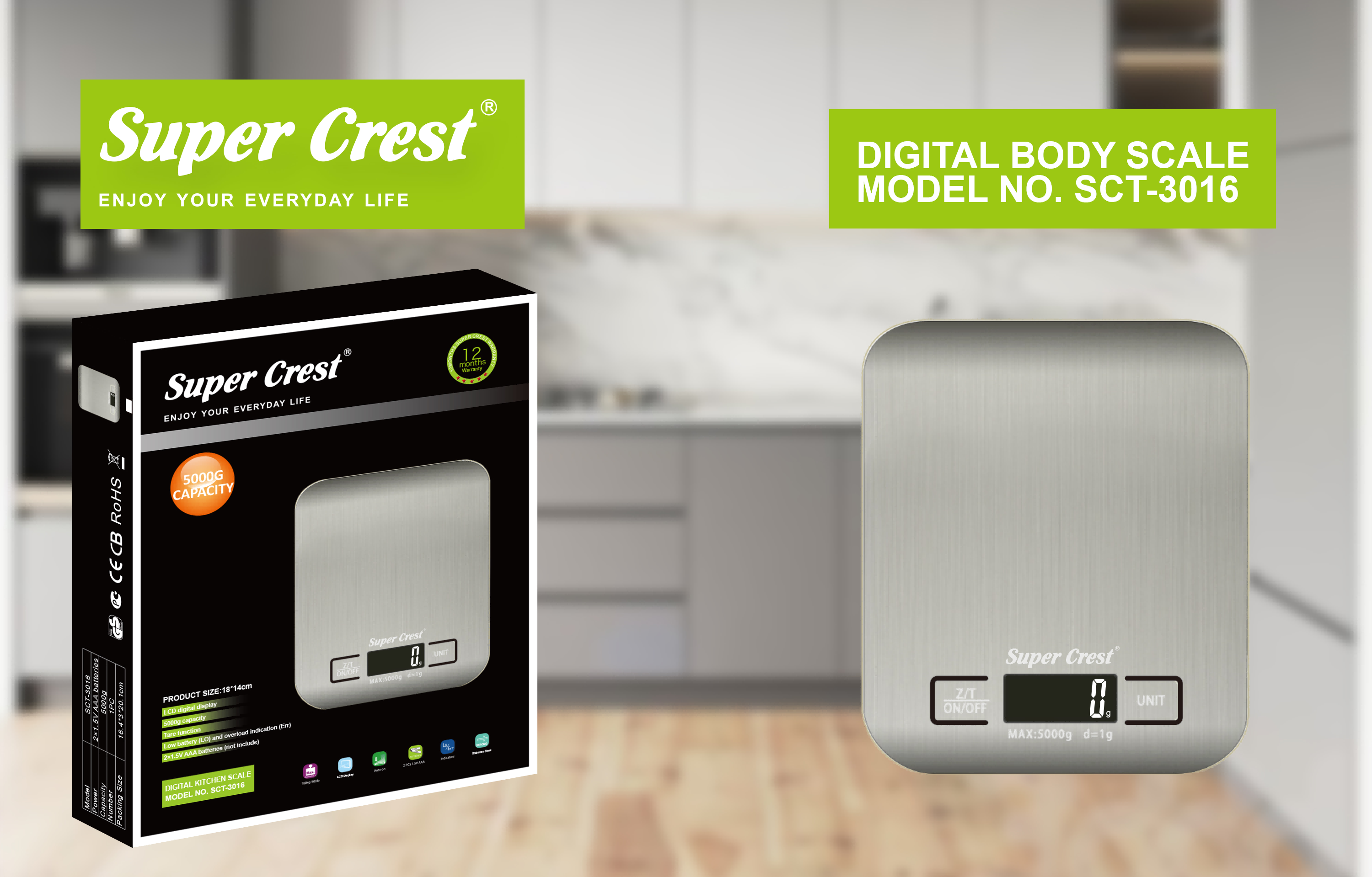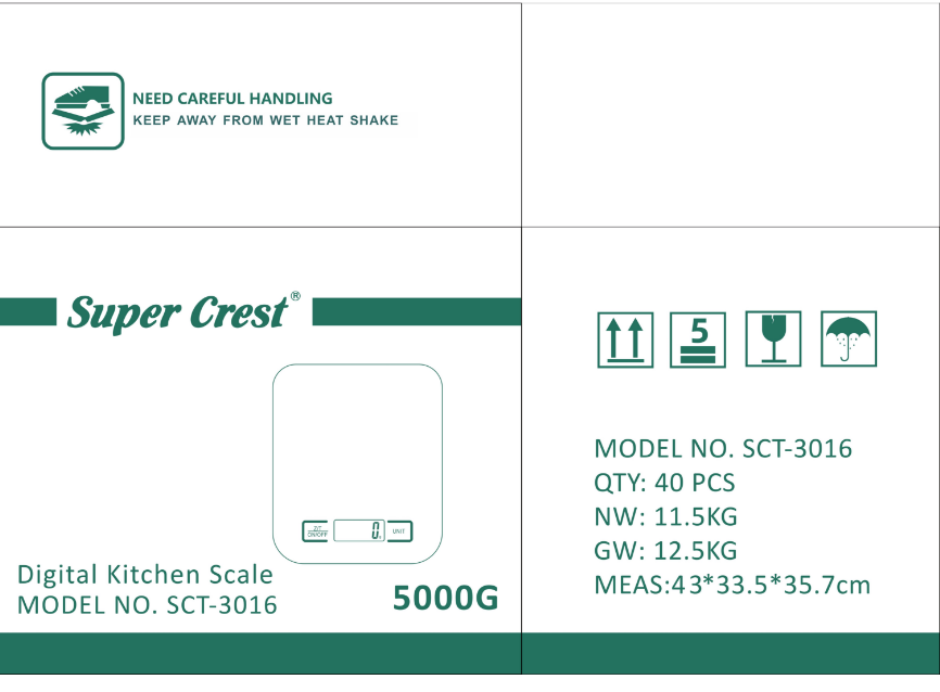 产品尺寸:18×14cm LCD 液晶显示 最大称重:5000g 去皮功能 低电量及过载提示 2 节 1.5V AAA 电池(不含电池)