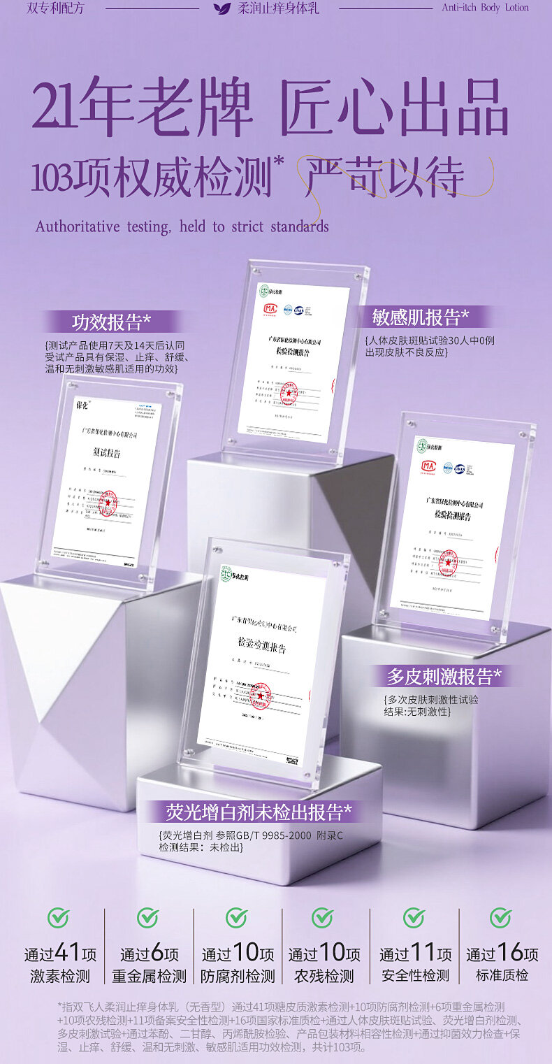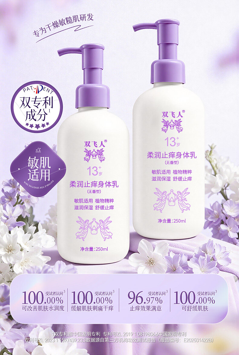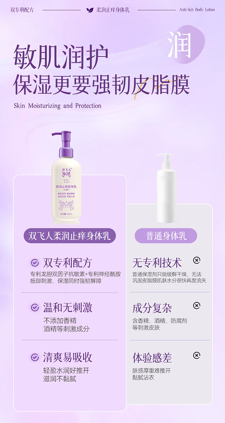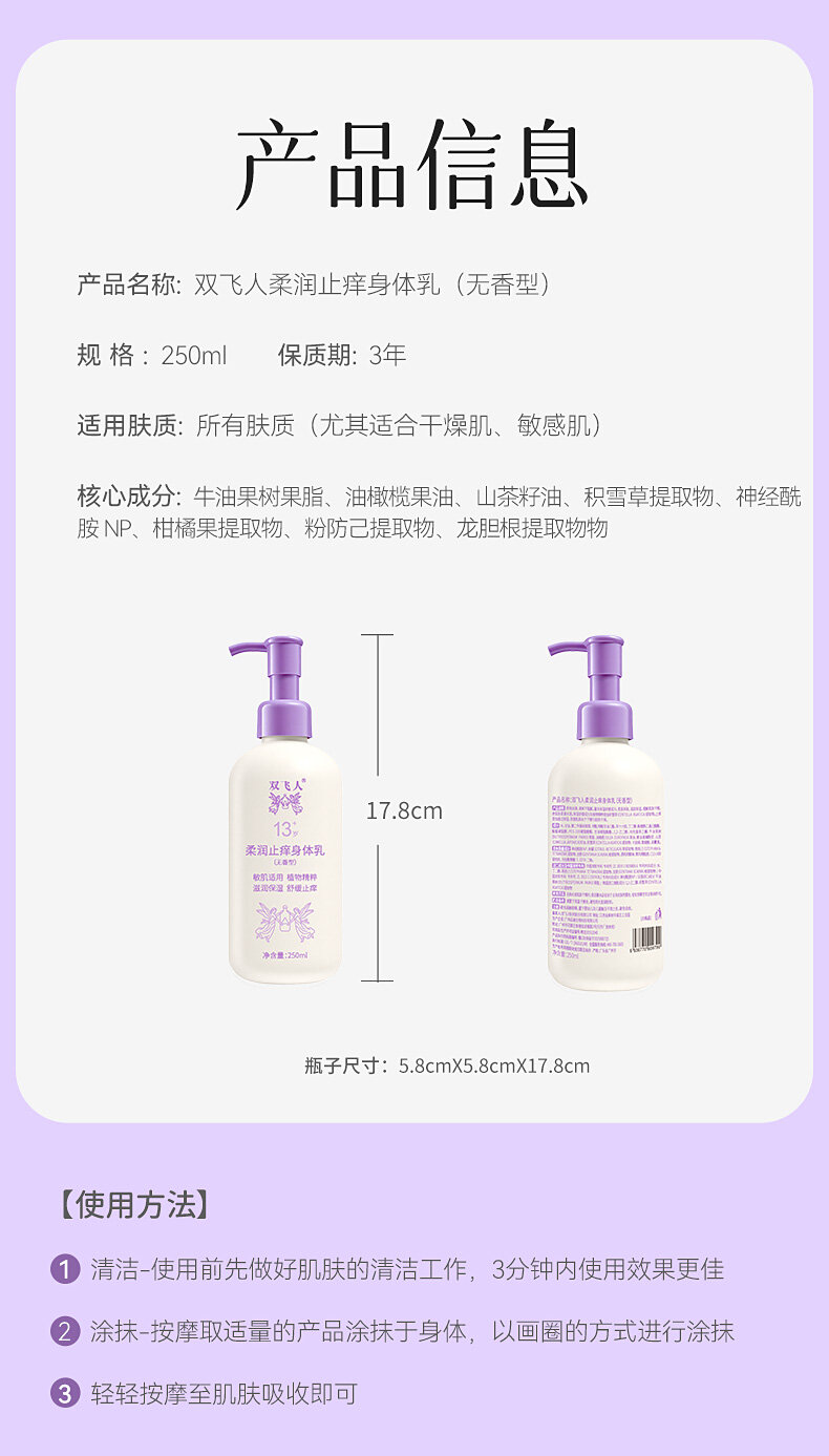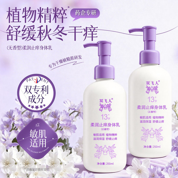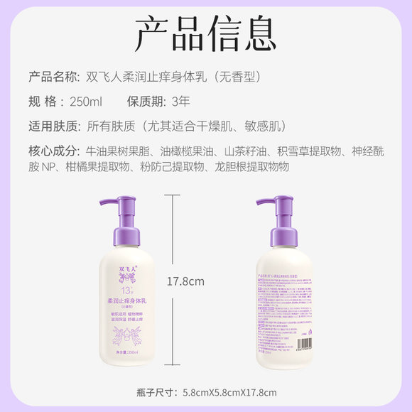双飞人250ml柔润止痒身体乳保湿滋润女皮肤干燥舒缓修护润肤乳露无香型