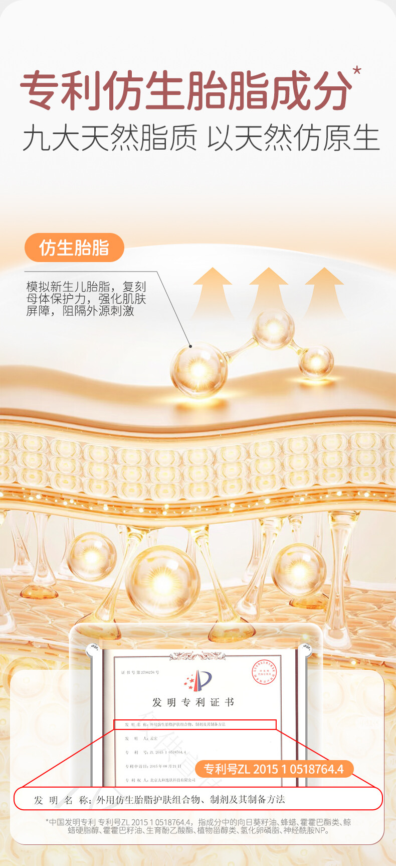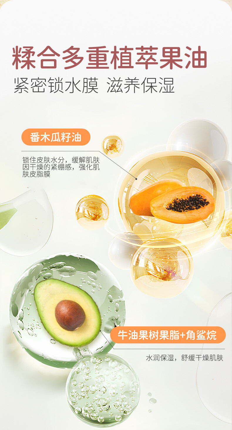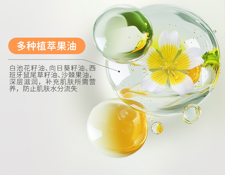 仿生胎脂、番木瓜籽油、牛油果树果脂、白池花籽油、角鲨烷、向日葵籽油、番茄果提取物、白柳树皮提取物