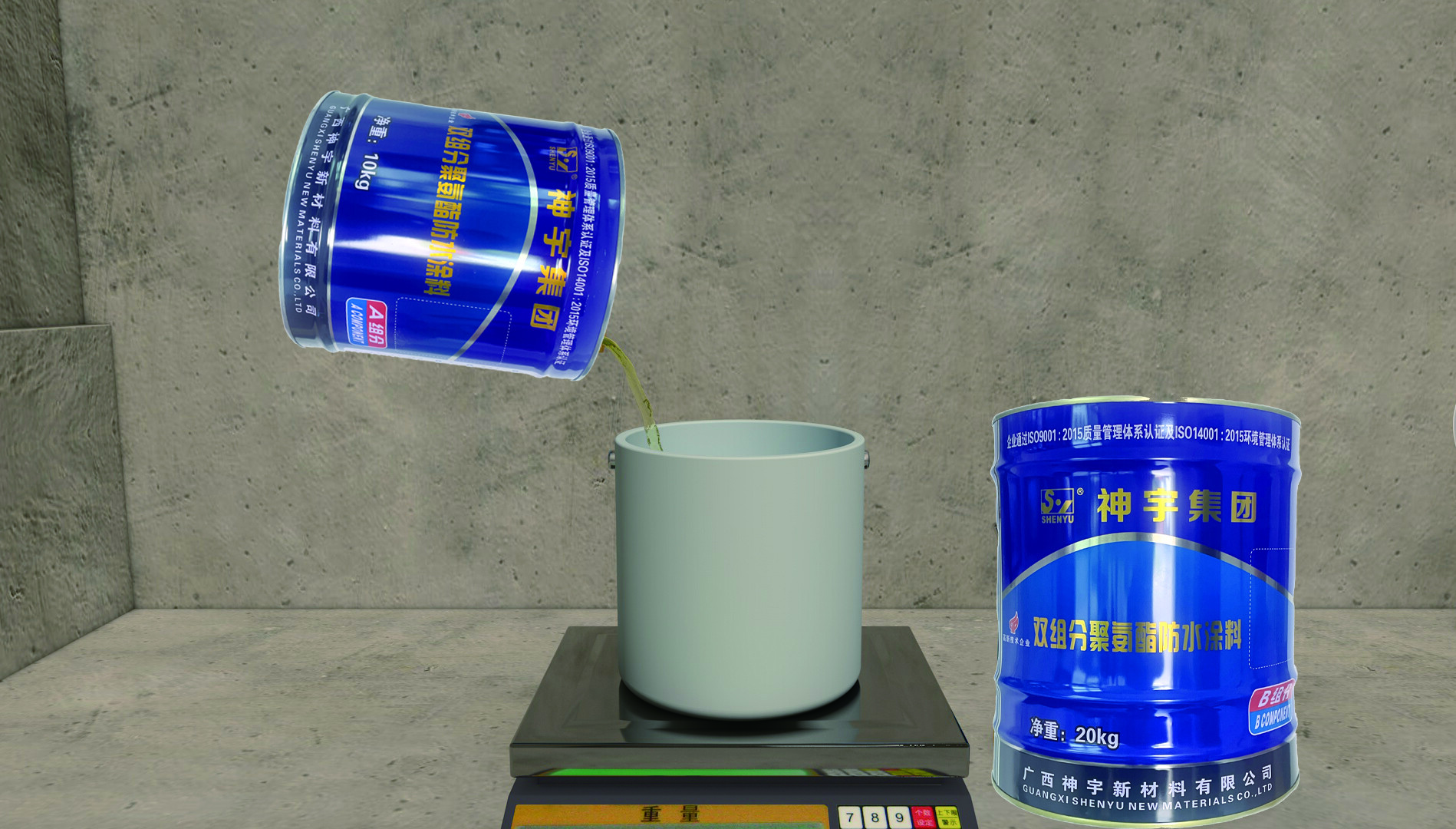 2. 配料:将 A 组分倒入 B 组分包装桶后机械搅拌 5 分钟直至均匀,搅拌后