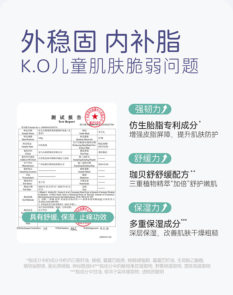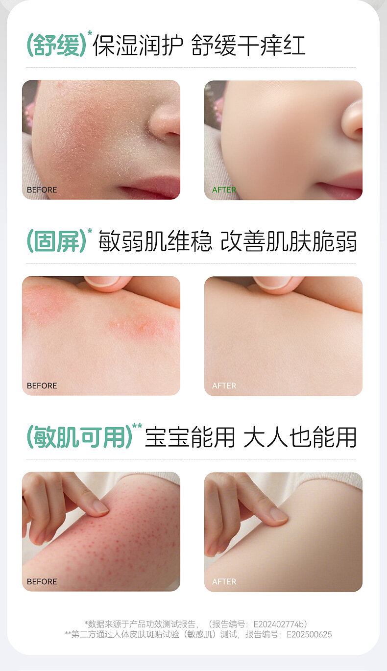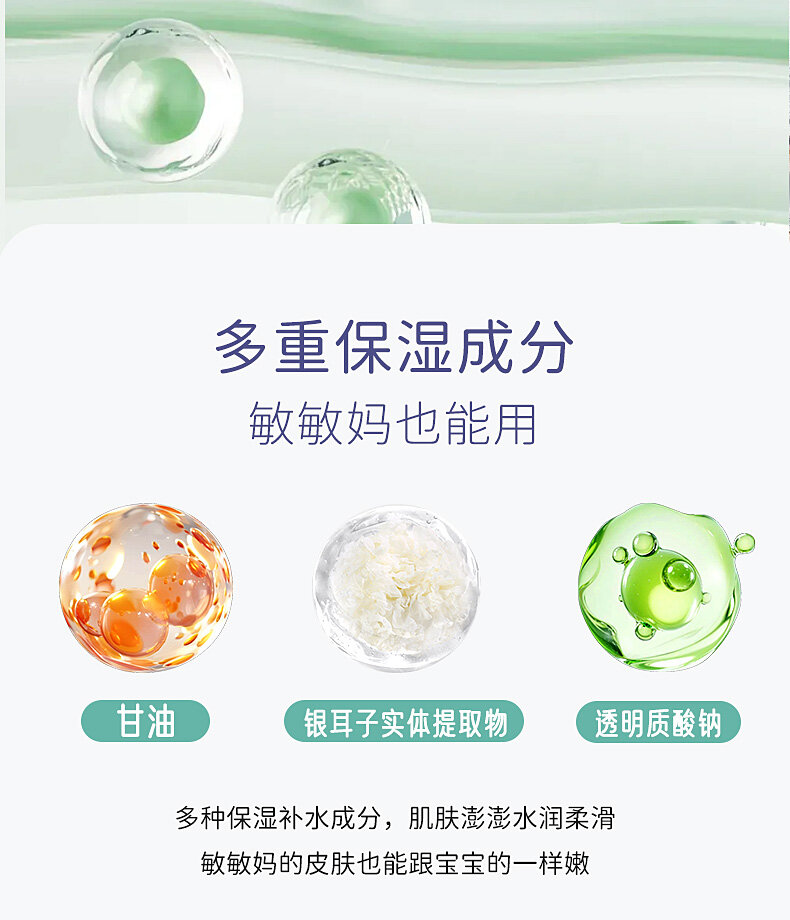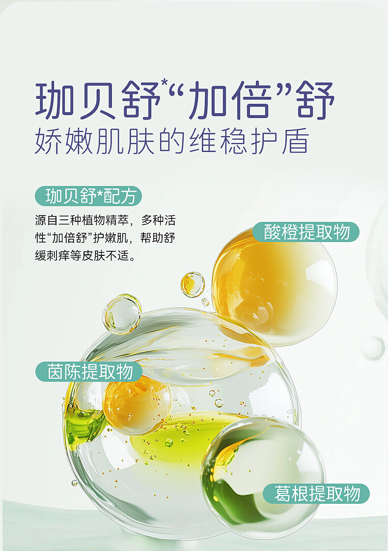 珈贝舒(水、丁二醇、酸橙果皮提取物、茵陈蒿提取物、野葛根提取物)、红没药醇、甘草酸二钾、仿生胎脂、燕麦β-葡聚糖、银耳提取物、积雪草、马齿苋