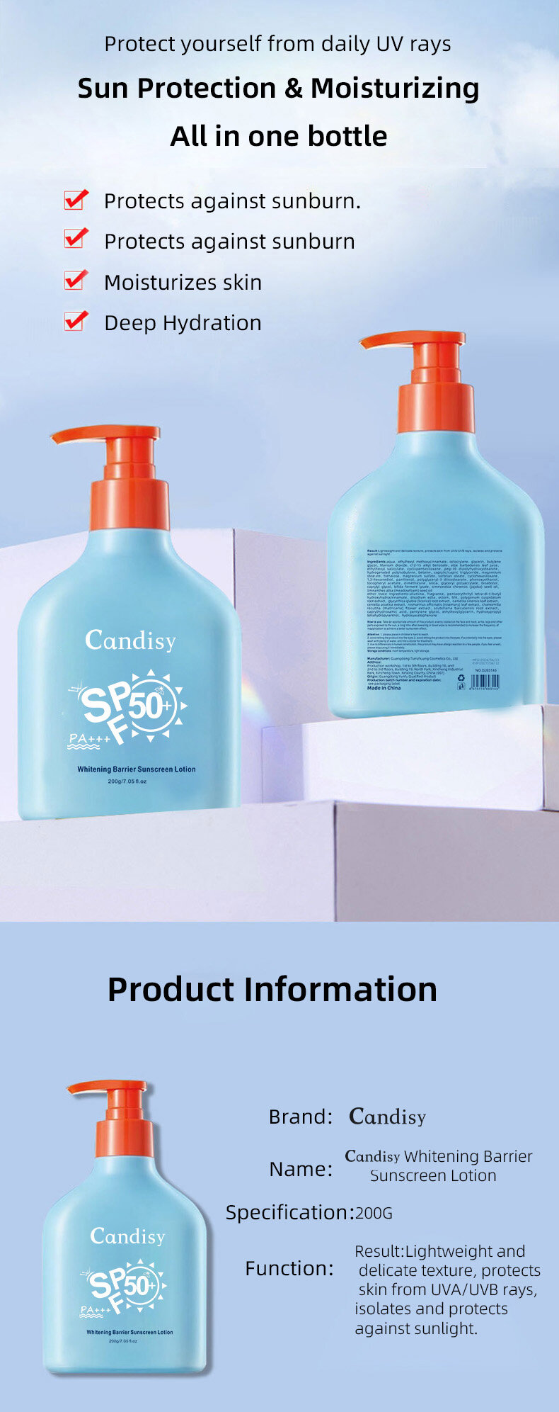 乳液质地,肤感清爽,防止晒伤、延缓光老化 、减少色素沉着、提亮肤色、预防“光老化型”毛孔粗大 、防止晒后脱皮
