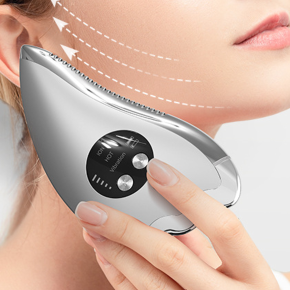 自动关机:10分钟。电池/充电时间:802038/3.7V/600mAh。认证:CE、RoHS。解锁小V脸,打造少女脸。离子微电流提拉按摩美容仪。1. 离子微电流促进护肤品吸收。2. 持续温热按压促进血液循环,舒缓肌肤。3. 振动按摩。4. 5档可调节强度,满足不同人群的需求。5. 提拉紧致面部。6. 可充电:方便携带。
